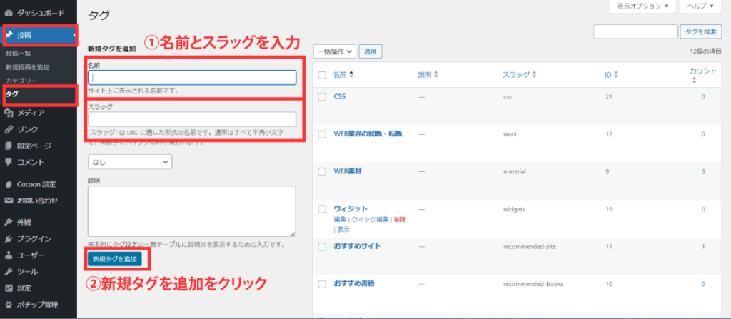 【名前】と【スラッグ】を入力して【新規タグを追加】をクリックしましょう。