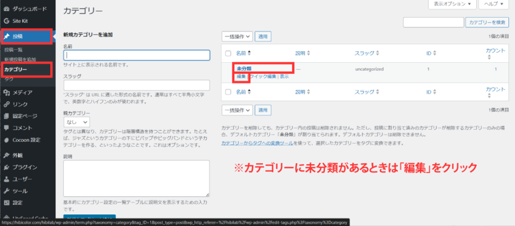 【投稿】→【カテゴリー】→未分類の下にある【編集】をクリック。