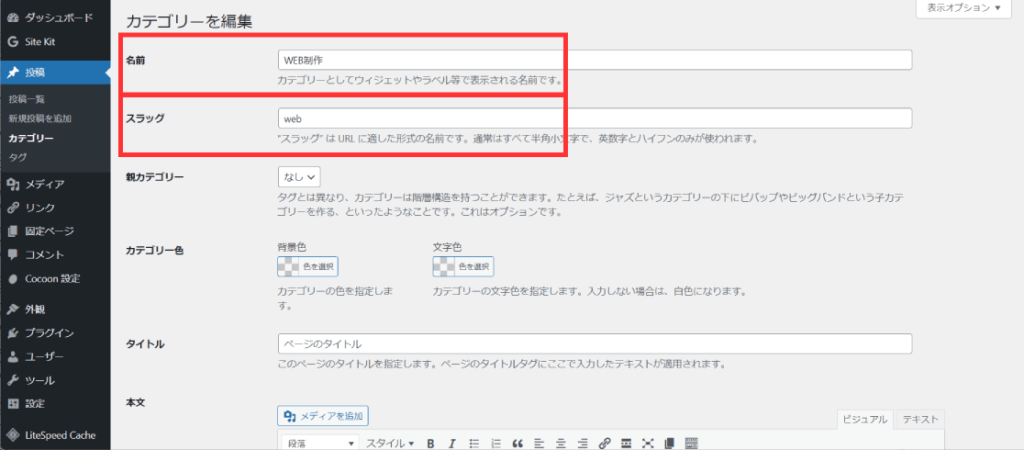 例:サイトアドレス.com/category/○○/ ←この○○の部分に設定したスラッグが入力されます。