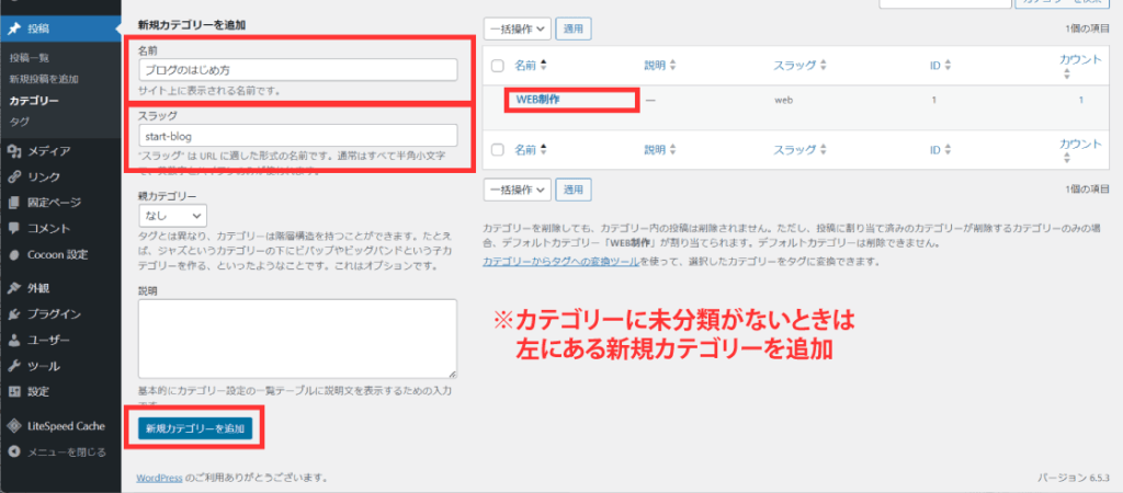- カテゴリーをはじめて作る、もしくは未分類がある場合