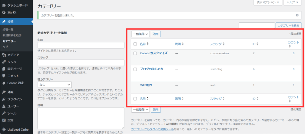 【名前】と【スラッグ】を入力して【新規カテゴリーを追加】をクリックしましょう。