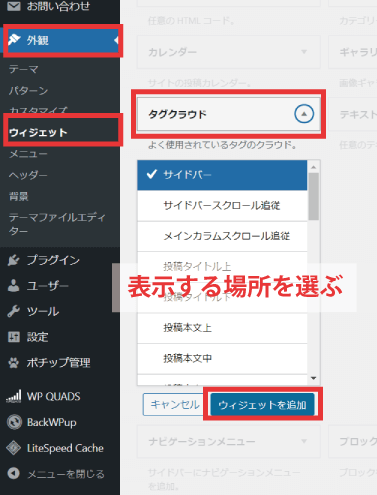 【外観】→【ウィジェット】→【タグクラウド】ウィジェットを表示したい場所にドラッグするか、選択して【ウィジェットを追加】をクリックします。